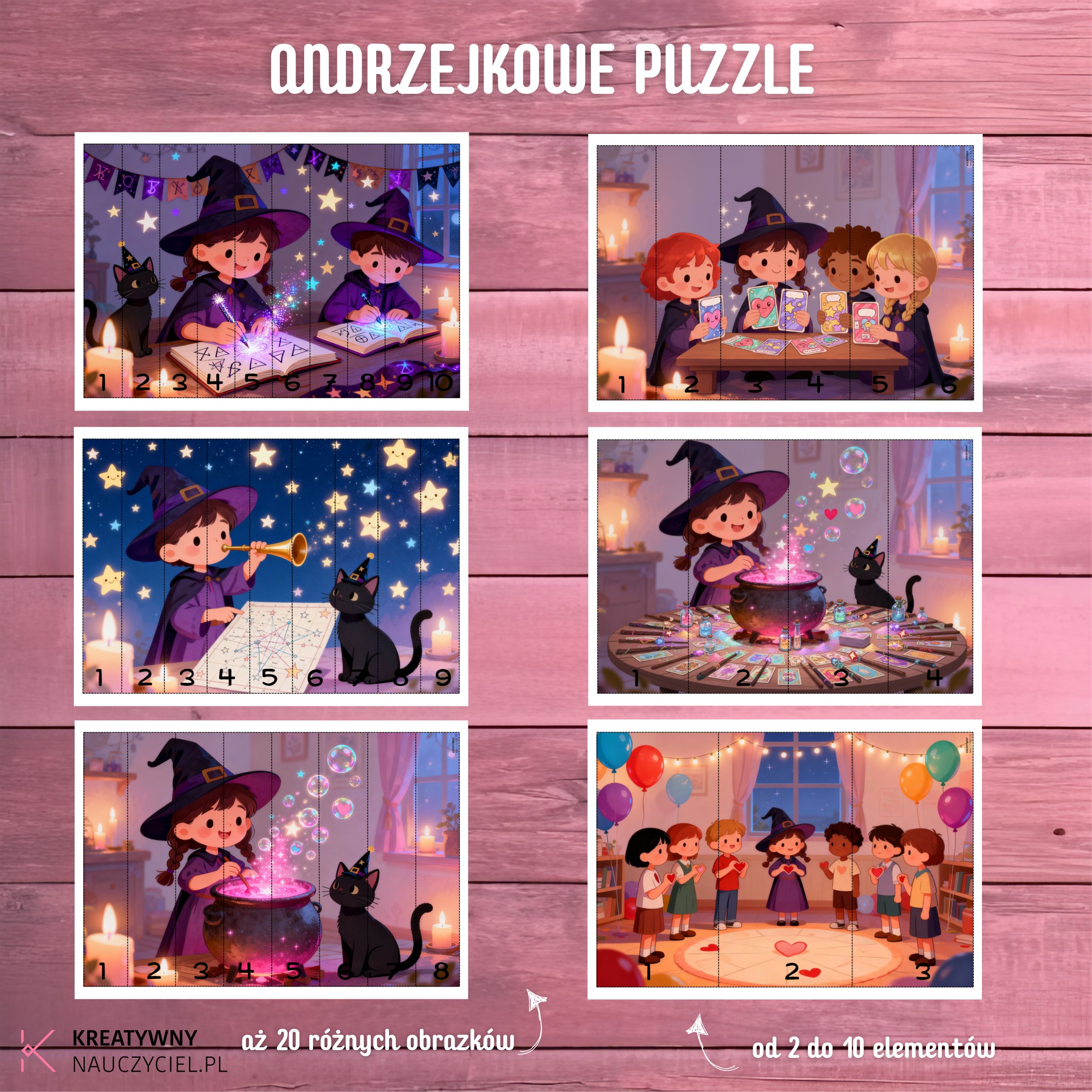 Puzzle przedstawiają zaczarowane sceny z czarownicą, magicznym kotkiem, kulą wróżb i zabawą andrzejkową — każde dziecko chce ułożyć je do końca i odkryć ukryty obrazek.