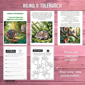 Zestaw jest doskonałym narzędziem do nauki przez zabawę 🎉. Dzięki tej bajce i kartom pracy dzieci nie tylko poznają wartość tolerancji, ale także uczą się, jak budować pozytywne relacje z innymi. Bajka o Tęczowej Dolinie pomoże w zrozumieniu, że każda istota bez względu na różnice, ma swoje wyjątkowe miejsce w świecie 🌍💫.