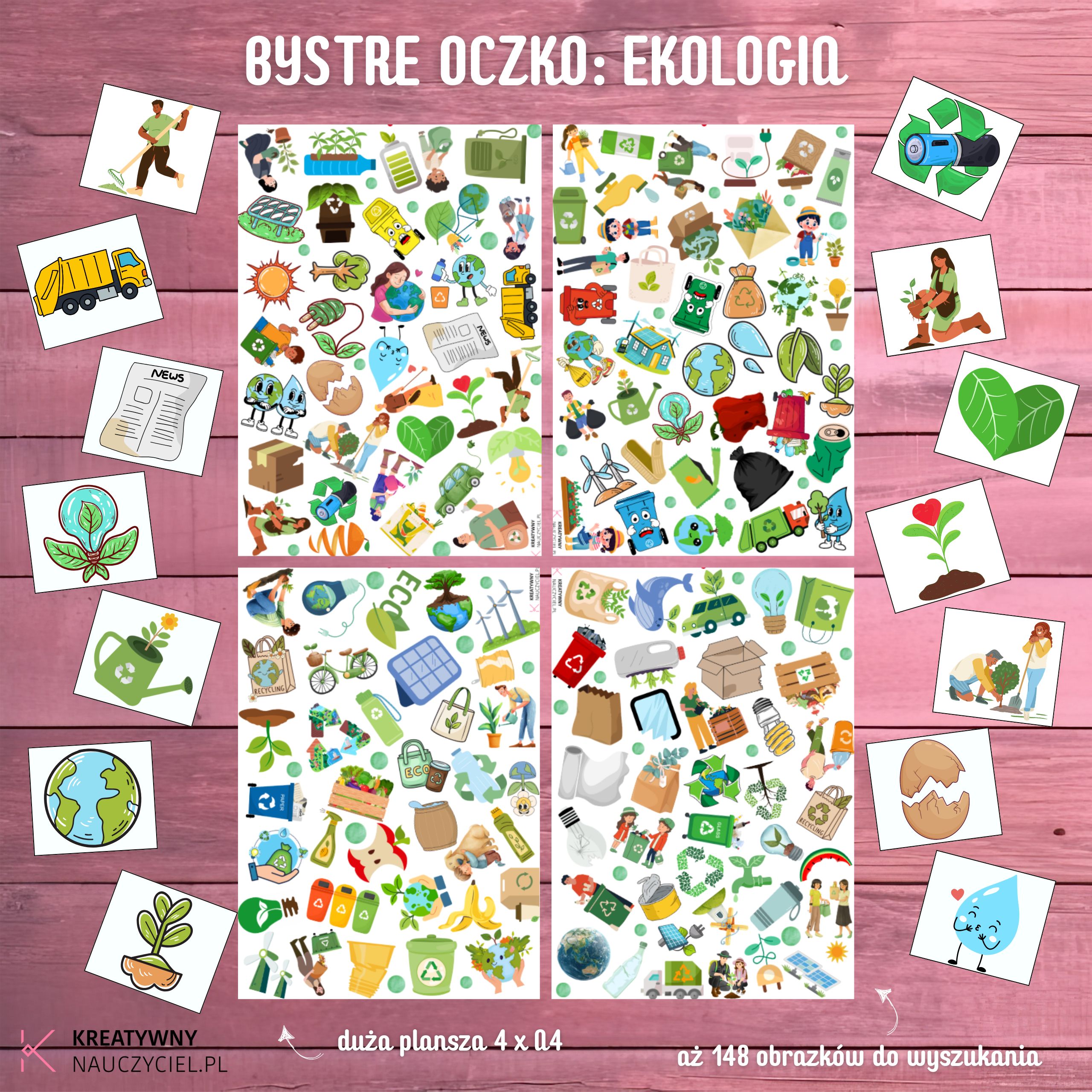 Zadaniem dzieci jest jak najszybsze odnalezienie wskazanych obrazków na dużej planszy pełnej ekologicznych ilustracji. Wśród nich znajdują się symbole recyklingu, rośliny, zwierzęta, odnawialne źródła energii i wiele innych elementów związanych z ochroną środowiska. 🌱🔎
