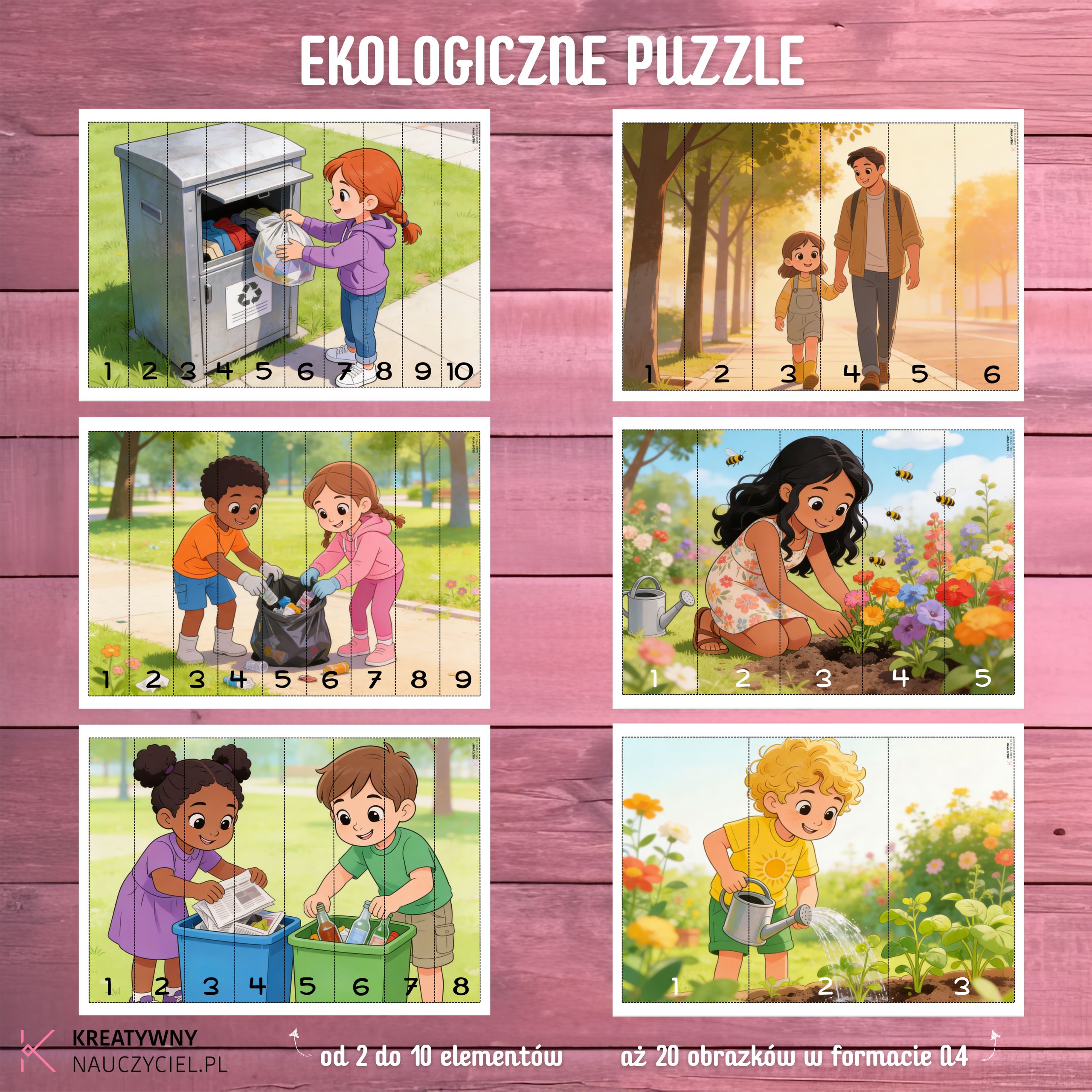 Każda ilustracja przedstawia sytuacje związane z dbaniem o środowisko – segregowanie śmieci, sprzątanie, podlewanie roślin, spacer zamiast jazdy autem czy troskę o zieleń. 🌱♻️ To doskonały sposób na rozmowę o ekologii poprzez zabawę i działanie. Materiał świetnie sprawdzi się w przedszkolu, szkole oraz w domu – podczas zajęć indywidualnych i grupowych. 🏫📚