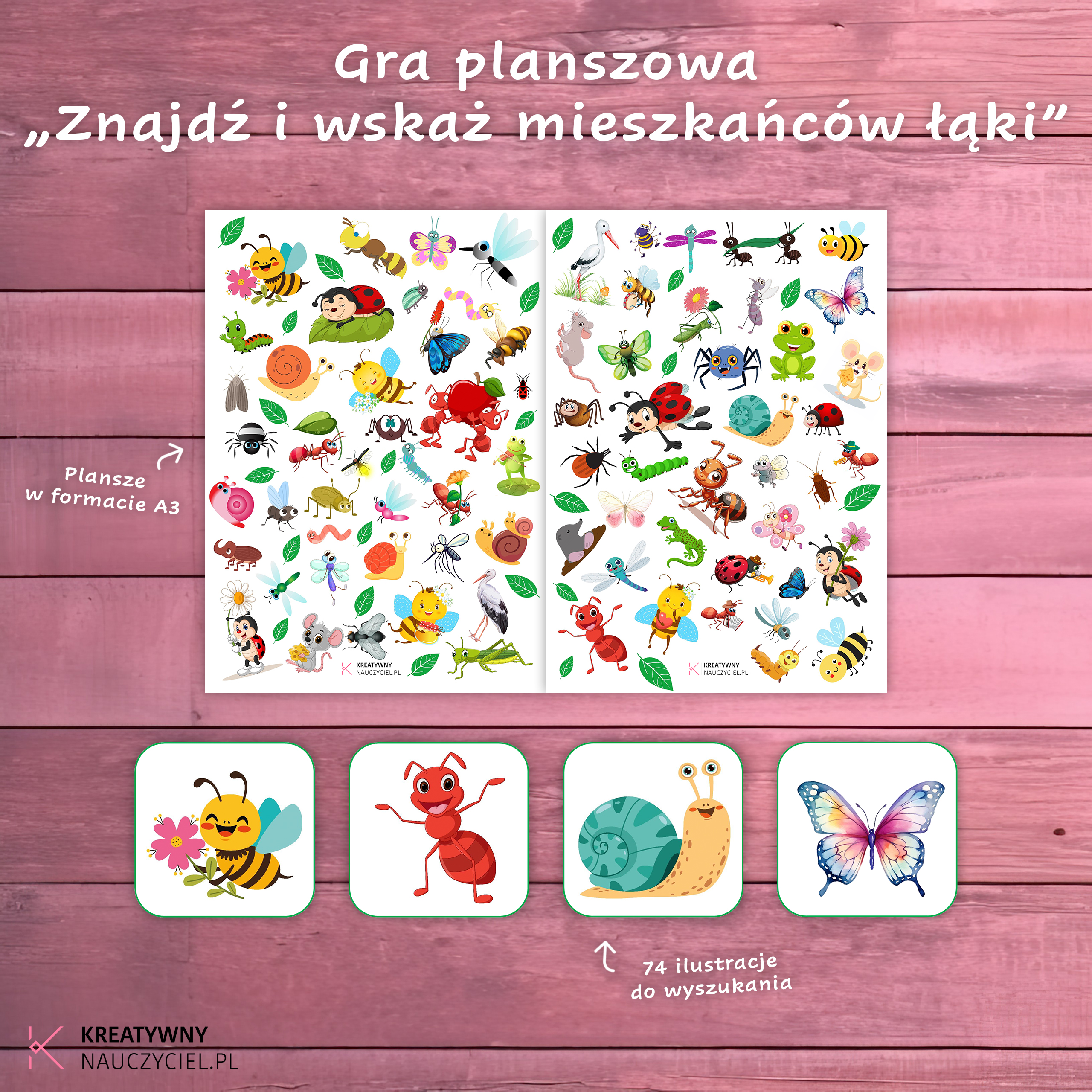 „Znajdź i wskaż mieszkańców łąki” to gra polegająca na znalezieniu ilustracji, które znajdują się na plakietkach i wskazaniu ich na planszy do gry.