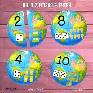 🌎🔢 „Kula Ziemska – cyfry” to atrakcyjna pomoc dydaktyczna, która łączy naukę liczenia z tematyką ekologiczną. Dzieci poznają i utrwalają cyfry od 1 do 10, dopasowując różne sposoby przedstawiania liczby – cyfrę, układ palców, kostkę do gry oraz odpowiednią liczbę elementów. 🖐️🎲💡