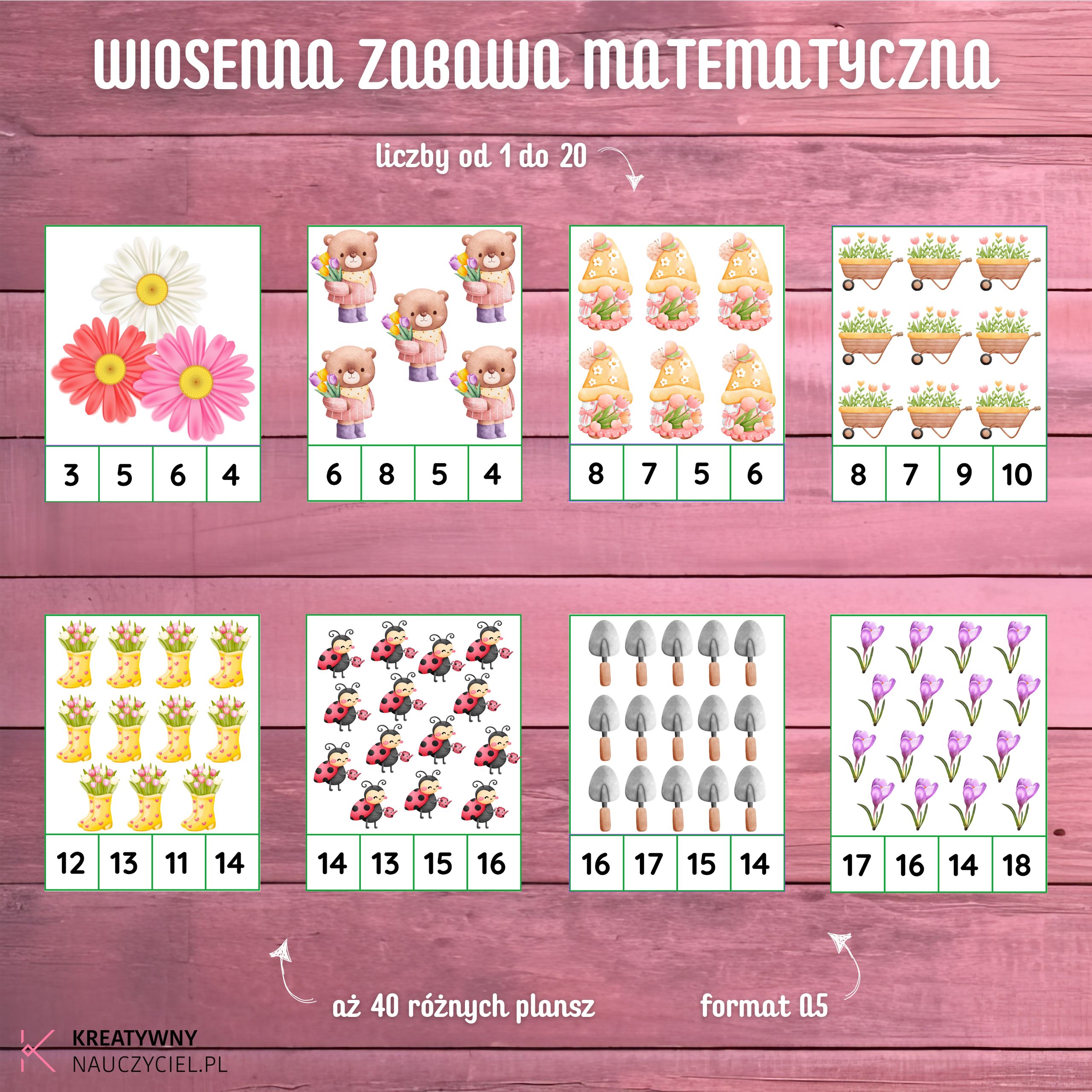 „Wiosenna Zabawa Matematyczna” to wyjątkowa gra edukacyjna, która wprowadza dzieci w wiosenną atmosferę, pomagając im rozwijać umiejętności liczenia w sposób pełen radości i kreatywności! 🌷 Dzieci będą miały za zadanie wskazać poprawną odpowiedź, wykorzystując np. klamerkę lub inne pomoce. To świetna zabawa, która rozwija zdolności matematyczne i wspiera naukę liczenia.