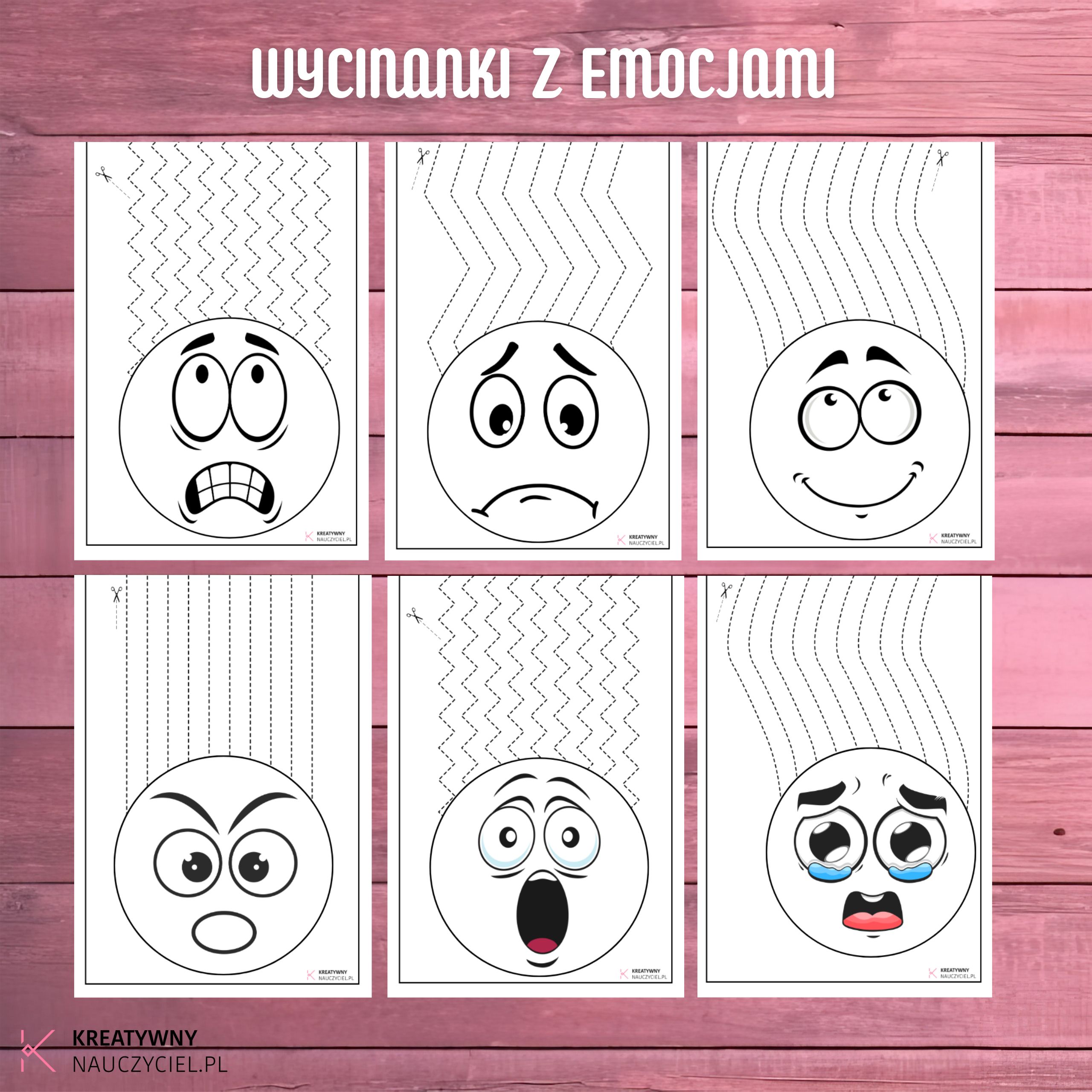 Te karty pracy łączą naukę wycinania z edukacją emocjonalną. Każda karta to buźka wyrażająca inną emocję, a zadaniem dziecka jest wycięcie po liniach prowadzących do głowy postaci.